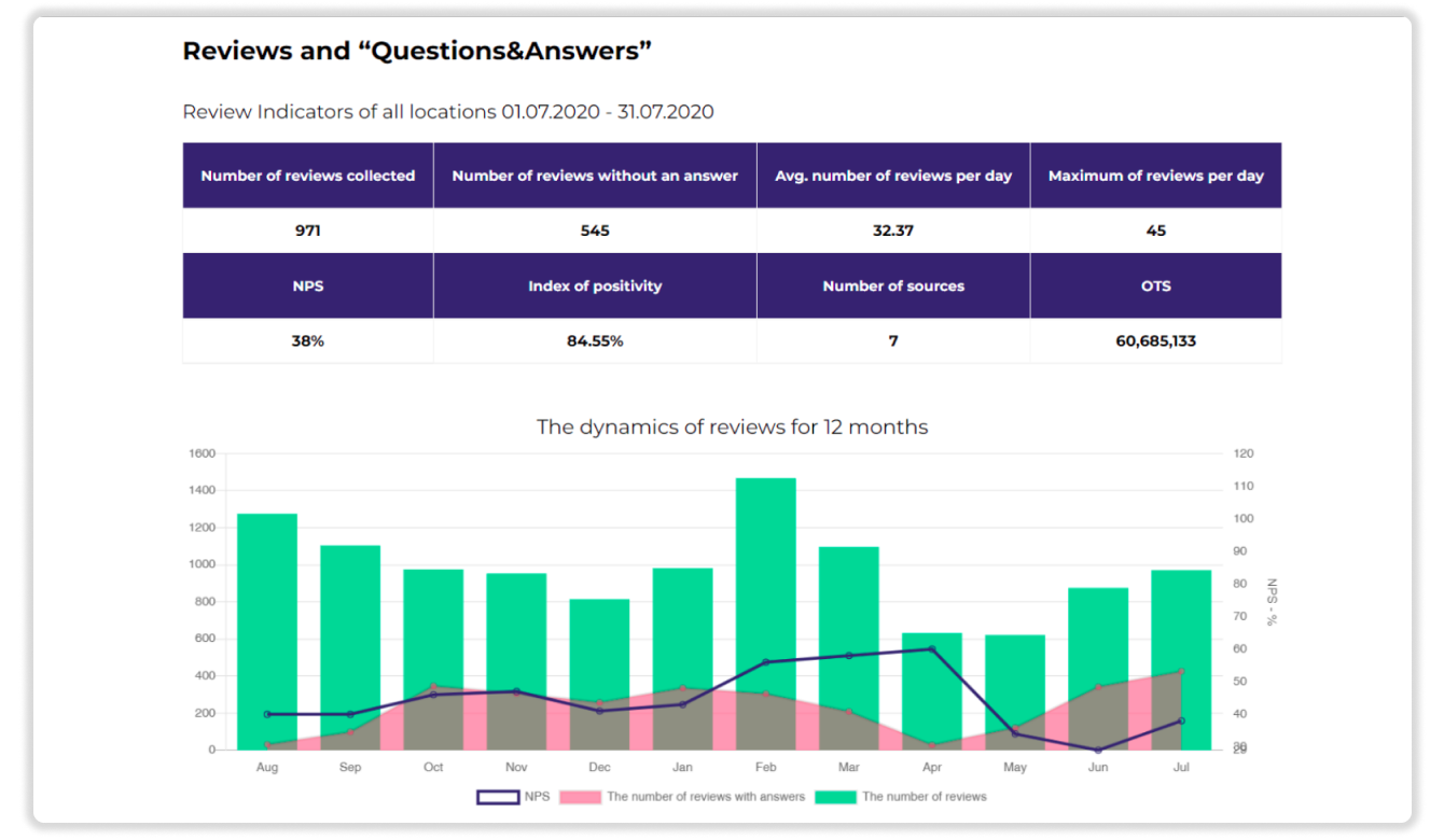 Tendrá acceso al número total de reseñas del período seleccionado y su evolución, el porcentaje de reseñas sin respuesta y el NPS (Índice de Satisfacción del Cliente) presentado en un informe mensual.