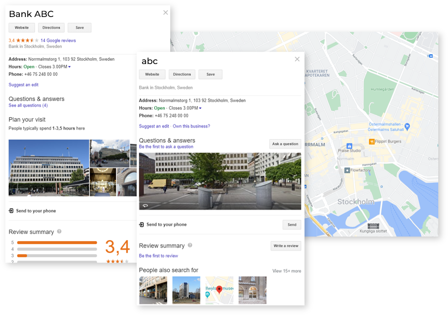 Cada vez que encuentra una ficha con el mismo nombre o nombres alternativos de su empresa, pero cuya dirección no coincide con ninguna de sus direcciones reales, ha encontrado una ficha falsa.