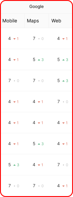 Monitoree la tendencia, ya sea de ascenso o descenso, de sus posiciones en la lista de resultados. Haga seguimiento de las ubicaciones para cada término o palabra clave en todas las plataformas.